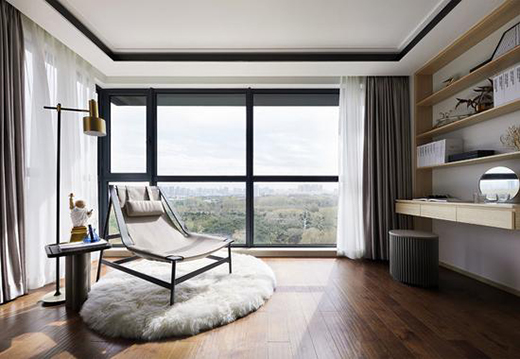 在两面大落地窗前,简洁书架、皮质躺椅、毛绒地毯搭配极佳的观景视野,推窗见葱郁树林,呼吸间是沁人鲜氧,得一隅休闲自在。