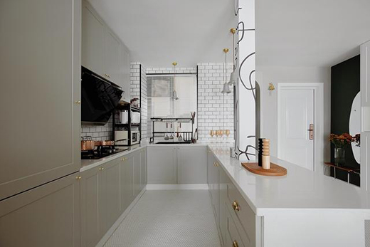 玄关与厨房的地面都做了水泥灰的地砖,这样比地板更好带一些;在玄关的右手边就是开放式的厨房,厨房与玄关的连接处定制了一排橱柜也作为一个日常的休闲吧台,那根不能拆除的管子包起来后用花砖装饰不仅不会觉得突兀反而成了一个装饰;灰色的橱柜搭配金色的拉后,在吧台和台盆上方都加了铃铛形状的吊灯,既有情调也能增加照明;