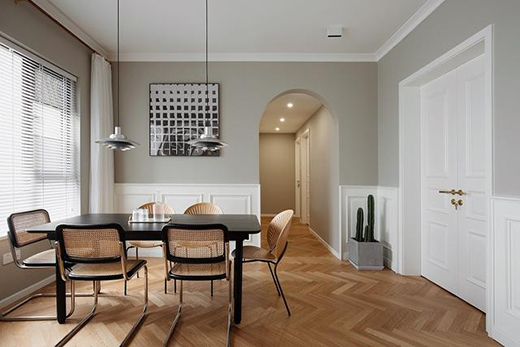 在沙发的背后是餐厅,整个客餐厅的浅灰色墙面都做了半高的白色护墙板墙裙设计,这样更能让空间有立体感;餐厅的吊顶很简单只是做了一圈石膏线条,但是看上去并不单调;原木色的地板,黑色的餐桌椅,既有精致也有沉稳,色彩在深浅之间互相缓和着;