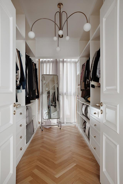 在餐厅的右手边有一个两扇门的房间,这里其实是一个宽敞的衣帽间,大概只有大户型才有设计一个这样衣帽间的底气吧;衣帽间的地面是从客餐厅延续进来的地板,白色的衣柜、金色的拉手,虽简单但也不失时尚和设计感,弧形吊灯更是精致;