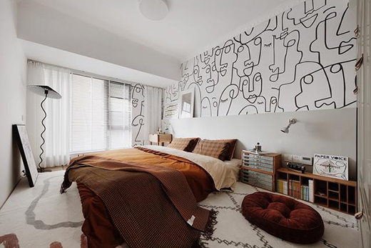 朝南的一个大房间做了主卧,主卧里的设计很是与众不同,也是我自己比较喜欢的地方,地面在地板的基础上加了一整块地毯,床头背景以黑色抽象线条画装饰,很有个性,在基础灰白色调的基础上,搭配红褐色的床品,床头两侧的复古壁灯和床头柜给卧室增加了温馨和温柔的氛围;