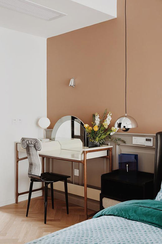 暖暖的橙色与高级灰的护墙板拼接成的床头背景墙,其他墙面以白色饰面,这样的搭配很是推荐,以三面墙来烘托一个主背景,这样颜值会更高;设计师选择了黑色的皮质床头靠背和银色的吊线灯,又增加了复古大气的元素;一旁复古造型的梳妆台和梳妆椅,只看一眼便知这里一定居住着一个温柔明朗的女子;