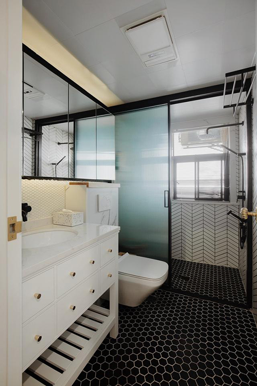 公卫里是标准的三件套,淋浴房、马桶和台盆柜,黑色六边形的地砖,白色鱼骨拼接的墙砖,黑白之间是极致的简约;