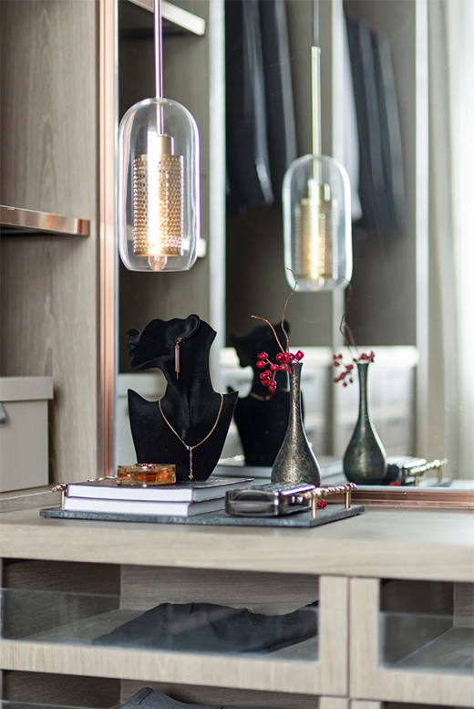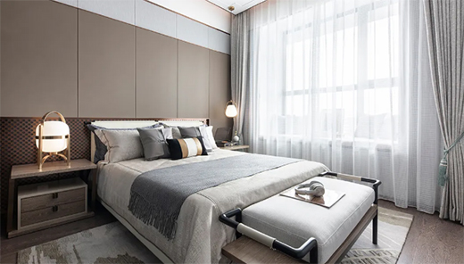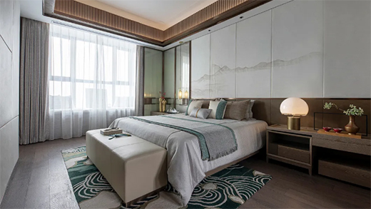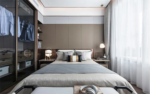 幽林信步,顿至婉转。主卧空间延续典雅浅淡的基调,摒弃了繁冗复杂的装饰,删繁去简,引自然之气入室。