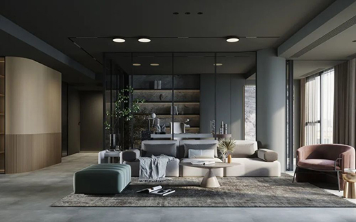 ▲客厅设计极具艺术感,将艺术源于生活,生活创造艺术演绎的淋漓尽致,整个居室演绎一场生活的美学之展。高级灰基调搭配木饰面,冷暖交融,和谐统一。一株绿植增添活力的同时,又带来一份宁静与惬意的氛围。