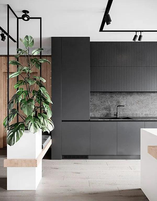 厨房位于客厅的后方,黑白色的台式中岛双层设计,上方的白色吊灯又突出了整个空间的艺术氛围,雅黑色的橱柜在空间中进行相互融合,让整个空间的层次氛围越来越丰富。