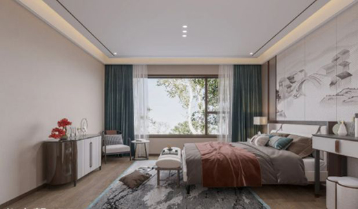 主卧的布置不讲求个性,舒适与放松感是这个空间所追求的,中式的水墨装饰的硬包床头背景墙,搭配着顶部的灯带设计,营造出一个精致舒适的休息空间。