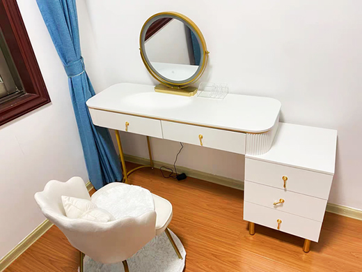 我们可以选择在衣柜旁边摆放梳妆台,起身时就不会磕磕碰碰,每天梳妆打扮也方便。摆放梳妆台的位置,光线不能暗,光线暗很难看出自己妆容效果。