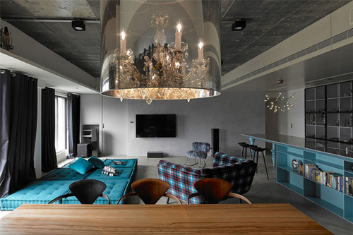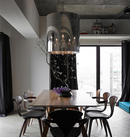 六个松软的垫子铺在地板上,就像乐高积木可以根据他们的日常活动需要随意移动。柜台后方定制的玻璃格子货架展示着孩子们收藏的乐高玩具,这样的设计和昏暗的窗帘、华丽的餐厅吊灯形成戏剧性的对比。设计师在墙面的设计上参考了客户的言语“粗狂中带有细腻”,正如工业风的天花板和浅灰色的胶合板地板。