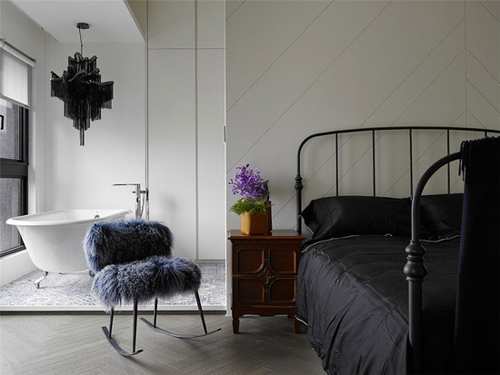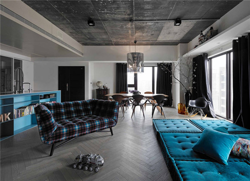 这间台湾公寓的客厅被设计成开放式的空间,集有餐厅和开放式厨房。客厅大面的落地窗提供充足的阳光和都市美景,周围是三间卧室。除了厨房和餐桌,大部分家具都被稀疏的布置,为了方便业主再不布置的需求。