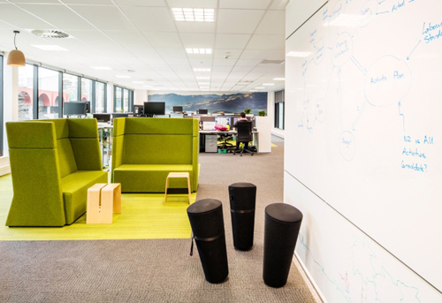 对设计团队的办公室设计,呈现的是放松、热情、强烈的户外冒险的氛围,醒目的绿色地毯搭配回收木材制作的墙面,kitchenette 的二楼反映的就是城市冒险,脚手架结构的下方就是协作区。