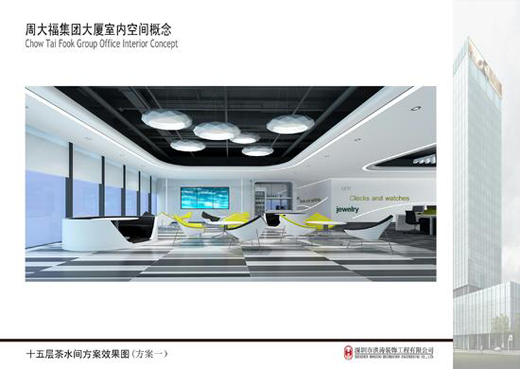 整个设计体现以人为本。在空间塑造上,注重室内与室外周边环境的交融,注重装饰造型语言的统一与延续,强调空间大体块的穿插组合,使空间更加整体大气,符合国际化装饰潮流,营造现代化办公空间氛围。在室内设计的装饰元素上,我们结合现代、简约的建筑外观设计,融入周大福相关产品的特征,提炼出装饰元素进行组合,将其运用到室内的天花、墙面、地面、灯具上使室内各个空间形成内在联系,加强了室内设计的主题概念性,营造出周大福企业文化的精髓——真诚,永恒。