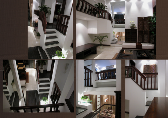 中式的空间描述,就像大家听说过的“亭台楼阁”。这是上海十几年前做的一个案例,利用两层的错层,客厅的部分是4.5米、4.5米往上叠。客厅旁边作为附属空间的部分,三米是正常的高度。错层和一般的高度变化时,就有比较小的、一米多高度的错落,所以这种小的错落里面就完成了类似这样的设计。这个案例有笔墨纸砚的元素,灯也是特别找来的。
