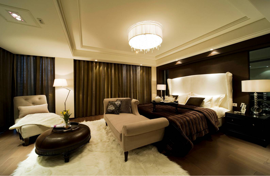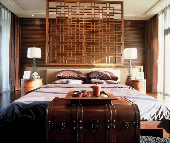 主卧房中间分了几个层次,用了一些传统中式图腾的屏风,来界定几个空间。走进来第一个洗手台,往下走是卧房,在往后面走是更衣室。这里没有完全用中式家具,只要是质感和我们的空间可以做成一个配合就可以的新式家具。