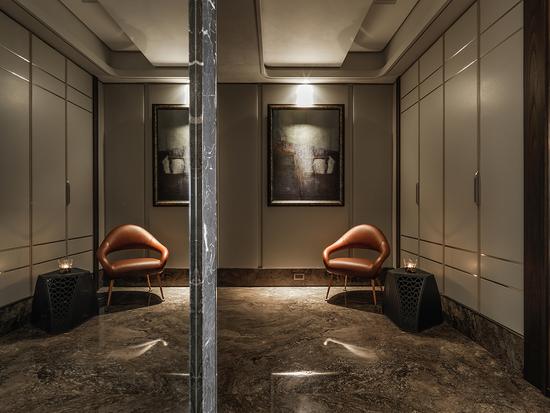 通道空间由于采光不足,利用浅色皮革材质,使其较为明亮。端点处的灯饰装点,再次为动线起到导向作用,事无巨细地体现设计师的用心。