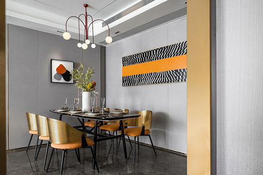 餐厅以高级灰色调铺呈整个墙面,借助大理石、绒面、玻璃以及金属古铜构建界面关系,既有过渡延展,又有细节层次,衬托出丰富多元的空间情感。