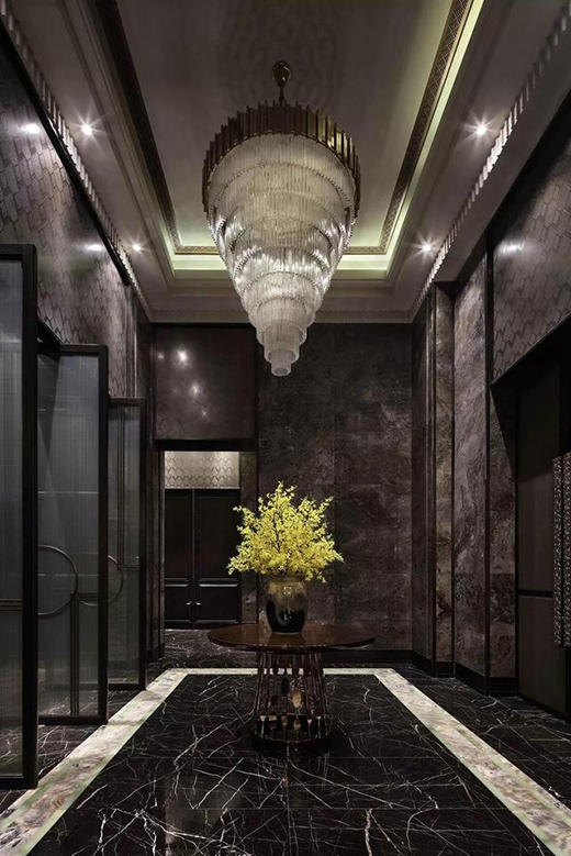 空间色调以沉稳具有价值感的深色为主,在细节的处理上会用暗铜色的金属条作为点缀,处处体现出精致、沉稳、优雅的特质,展现主人对细节的精益求精。一进入入口门厅,首先感受到奢华复古伦敦风的西方文化与摩登上海礼序东方美学在此交汇相融。