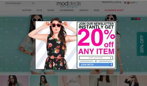 Moddeals网站采用是一种较为经典的图形-背景关系。当页面中的广告浮现时,网页的其余部分就变变暗,自动转化为背景。在这种情况下,用户依然可以拖动页面,然而广告还是会作为独立于背景的一部分停留于原处。