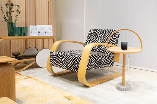 芬兰多树,80%的森林覆盖率让木质结构成为芬兰设计师的挚爱,国宝级品牌Nikari的设计灵感便是源于此。现场展示的NIKARI-ARTE SOHVA 沙发,其外形将北欧传统设计与当代设计结合,把精湛的制作工艺和可持续发展理念融入木质家具中,并采用了芬兰著名插画家Klaus Haapaniemi的经典森林动物图案,丰富又内敛地展现森林的原生之美。配合Nikari展示的设计作品则是来自著名设计品牌Artek的Tea Trolley桌几。 Artek是由有“芬兰设计之父”之称的Alvar Aalto和他的妻子Aino Aalto共同创立的,之所以与Nikari产品搭配展出,是因为在Alvar Aalto生命的最后几年里,Nikari工作室与其有着紧密的合作与联系。在他们的作品中,无论是风格和材质都能带给人关于生活的温馨联想,也同时能展现木的自然、稳重、温馨以及背后的生命力。