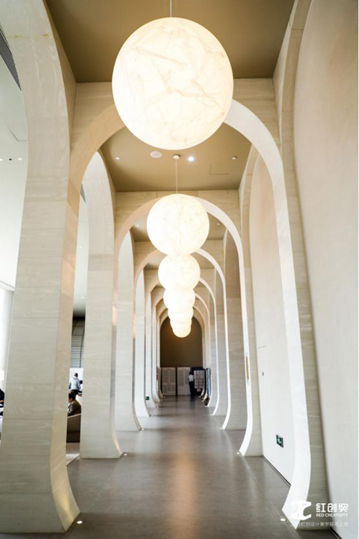 以国潮和文化为标签,天阅山河在文化的凸显上也为室内设计师们提供了灵感。仿造宣纸制作的墙面、以明代神兽长颈鹿为原型的迎宾吉祥物,七个月球灯打造的故宫七进概念等等为设计师们带来了空间国潮、世界审美的设计新理念。