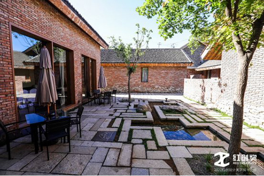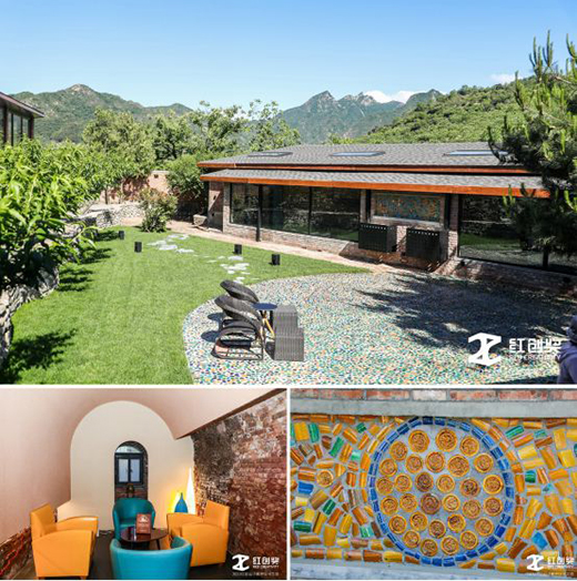 瓦厂酒店面朝慕田峪长城,由琉璃瓦工厂改建,是一家乡村遗产酒店。原本的窑窟变成了酒店的接待处、行李房、卫生间、娱乐室、放映室,别有一番体验。瓦厂的地上墙上,不时出现的图标、文字等,都是彩色碎琉璃拼凑成的,小小的像是一幅幅艺术画。