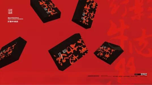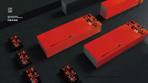 包装用具有洒脱·江湖气的毛笔字手写出“灯影牛肉丝"作为主画面·印章的形式凸显*山城品牌”·既具有精神文化内涵·也展现出重庆本土品牌的地道和灯影牛肉丝产品的特色·红黑的经典配色﹐为礼盒增添了神秘感﹐引起消费者的好奇·而且也使礼盒视觉冲击力更强。更加高端、大气。