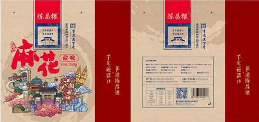 牛皮纸的外包装具有传统的意味,经典的红蓝配色则很好地表达出麻花传统小吃的经典形象。