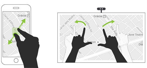 触碰屏幕时,触点就是起点——一个参照点。想象一下,典型的双指缩放和双手隔空构成类似的操作,两者有什么区别。缩放等级的参考点变得模糊不定。你也不能松开屏幕来停止操作,所以起始点和结束点都变得模棱两可。