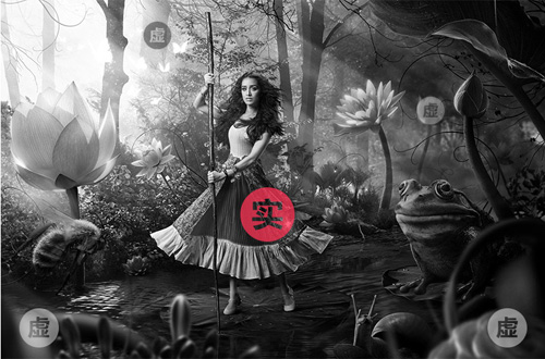 这张海报其实更接近于咱们生活中的实景拍摄,而且是那种有明显对焦主体,毫无疑问是图中拿着竹竿的美女。那这时,虽然前景的花草离我们更近,但是因为它们偏离我们的对焦点(我们的视线并没有直接去看这些花草),所以,这时候前景的花草我们也是去做模糊处理的,甚至有的时候模糊度比远处的场景还要明显。这个是需要了解的。那我们再看下海报中的虚实关系在网页中的应用。