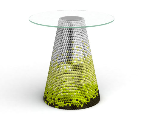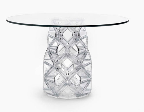 这款桌子设计于 2013 年,最有特色的桌子腿是吹制玻璃制成,精致细腻的纹路看上去更像是水晶,与上述的 Zipzi 折纸桌造型相当。迈克尔·杨在对于玻璃制作工艺进行考察时,发现这种人工吹制玻璃的工艺技术可以将玻璃变为像金属一样随意塑性的材料,于是他就大胆尝试设计出这件完全由玻璃制成的桌子,除了透明色,这款桌子还有琥珀色。
