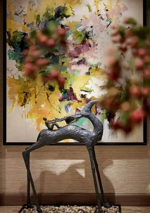 ▲走廊挂画:纽约画家Carlos Ramirez的原作 摆件为沈周来艺术家的雕塑作品