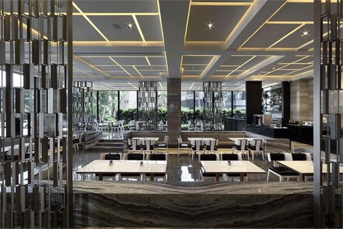一楼大厅,利用界面,创造了过道空间,在旅人的行走间转化下一次启程的心境,也因在水平中改变空间的应对,使得视觉的驻留多了丰富的层次关系,亦或在水平的视线中创造垂直线性的屏风,重复的元素让数大表现了美的本质。