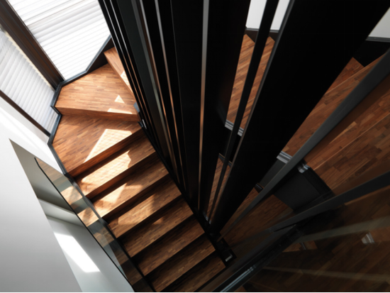 在《光影|经过》这个作品中,唐忠汉将光影随着季节迁化呈现着不断变化的面貌,通过空间设计表现了出来。顺应着楼梯与建筑开窗,重覆有序的垂直元素,利用突破尺度限制的格栅设计,变化阵列;调节自然的光线,可以从不同的面向穿透室内。