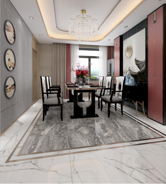 新中式风格,多以木质材料的家具居多,在装饰上则以山水字画为主。在欧神诺的新中式餐厅案例中,保留了山水字画、古色古香的木质桌椅等经典元素,在地砖上,也选择了仿经典天然石材纹理的海浪灰,凸显传统中式的特色,就连天花的吊顶灯源,也特意选择了柔和的暖色系光源。