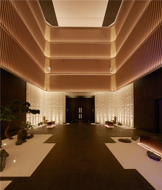 地上的纹路以传统榻榻米形状布局,而一片片向上伸延的强身及光线是模仿大自然竹林节节上升的意境。