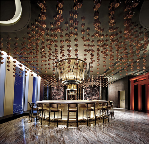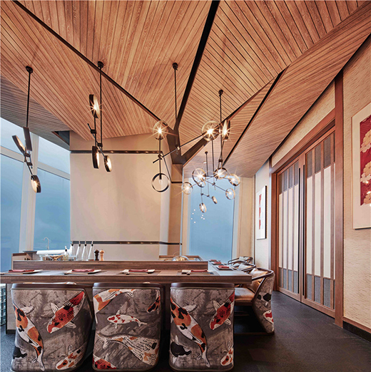 灯饰以日本剑组成,由两把形成一组,不由想起自由、灵巧且无规律的日本剑术,将其置于此,似是酒过三巡,两三知己一较高低的引申,一幅惟妙惟肖的画面便浮于眼前。