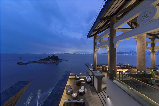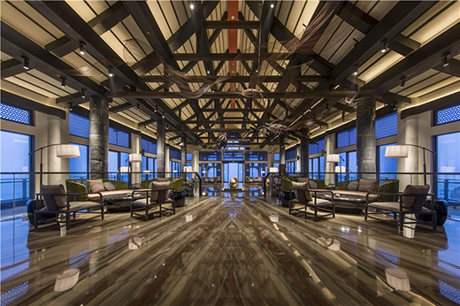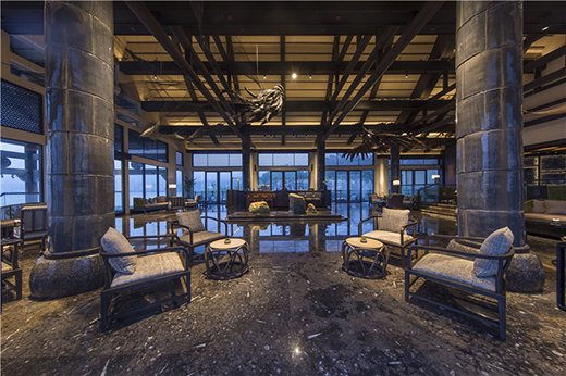 一对铜制的凤凰飞舞在酒店大堂空中。设计师用红铜打造风,用青铜制成凰,在偌大的空间上无声上演一出琴瑟调和的凤求凰。电影的镜头回落到窗外的大海,便能发现静立在大堂中央的黄石。在珠海情侣路的海边上,这种黄石甚是常见,在海浪不断冲刷之下底部会生成或深或浅的青苔。