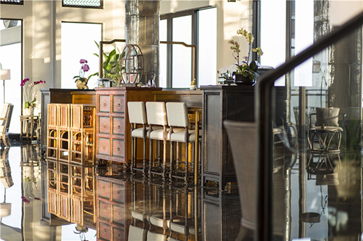 “混搭”贯穿了整个室内空间,一道既熟悉又陌生的木屏风映入眼帘,细看才能发现原来屏风上的纹理取自传统的葡萄牙地砖,设计师把地砖花纹抽取再重新组合在中式屏风,中西结合盎然成趣。