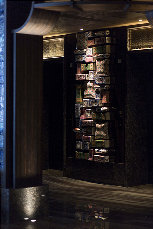 此时让我们把这出电影的镜头切到特色客房部。“磨刻为枕,以备暑月之用”,电梯门徐徐打开,设计师用不同形状和颜色的传统中式石枕作为墙饰,幽默而温暖地提醒来客:您即将进入睡眠区!趣哉。