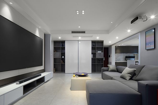 客厅:白色硬包与灰木交织的电视背景墙,朴素、精炼中透着优雅,与明亮而柔和的灯光作伴,简洁、大方、温暖!