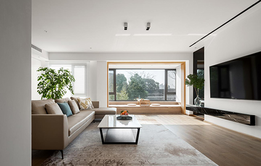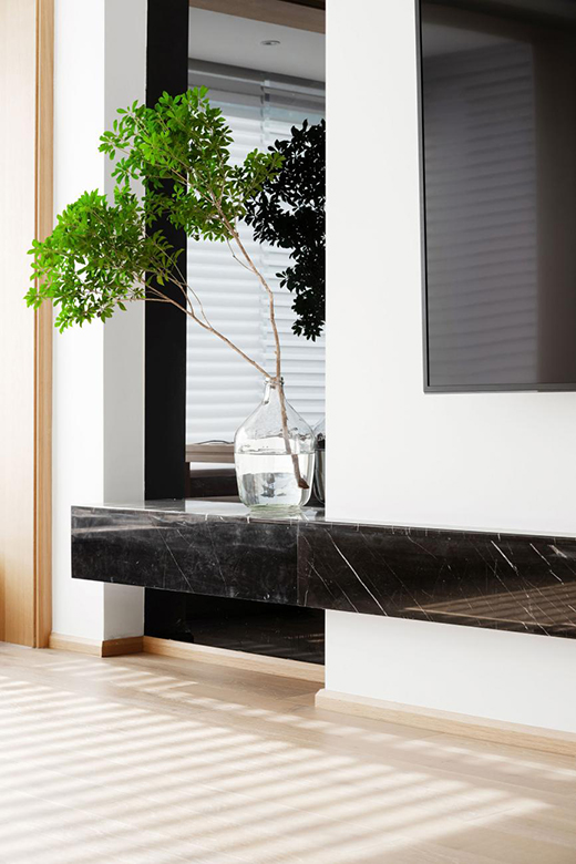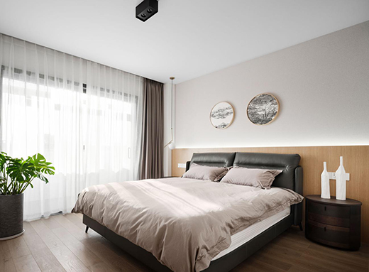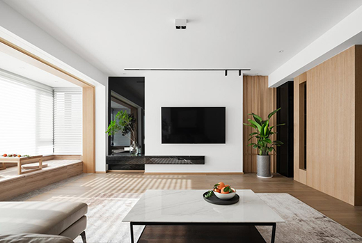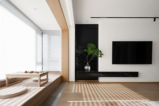 在设计师王明治看来,并不只有昂贵的材质能表达高级的设计,电视墙用简单的乳胶漆与质朴的木作,也可以营造出禅意之美。寥寥数笔,轻松勾勒出极简的韵味。