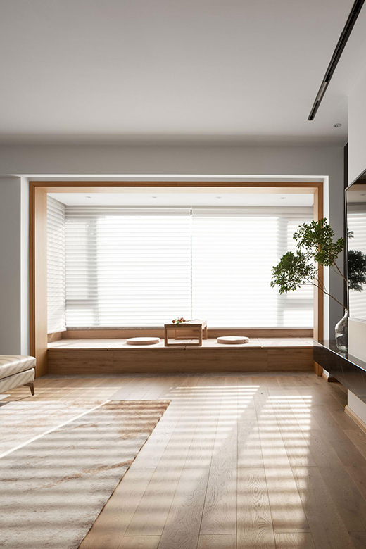 窗帘对室内格调的影响很大。本案拥有270°的真观景飘窗,如直帘就会浪费掉很大一块面积。设计师王明治选择了香格里拉帘,百叶的形状可以完美匹配窗户的尺寸,也让室内空间显得更大。