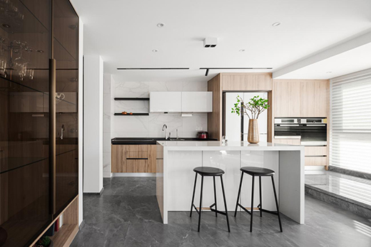 一层层高原本只有2.3米,一般用作健身房、影音室等休闲空间,本案业主并无此需求。本案设计师王明治将地面下挖40cm,做成开放式西厨和景观餐厅。
