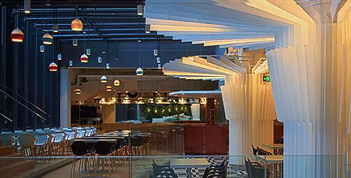 如果钻石大厅是一句现代色彩的禅语,那么“雨中曲”就是清新诗意的童话。“雨中曲”员工餐厅位于中关村东升科技园钻石中心的地下二层,清石的设计师巧妙地运用造景将地理位置的劣势转化为凝固建筑作品的灵动美。将柱子设计成巨大的蘑菇伞盖,与有限的玻璃采光结合起来,加上跳色的球形吊顶组成的悦动雨滴,让人如同吉普力电影中的借物小人般漫步在丛林之间,映目翠满、耳畔鸟鸣,鼻尖潮息,整个餐厅充满了一种动态美。该项目在白天造就了阳光微雨间的清新感,在夜间配合暖黄的灯光以及仿真绿植墙、绿色亚克力吧台则打造出森林小屋的温馨感 。