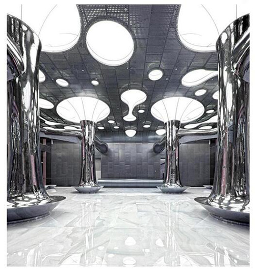 钻石中心大厅项目出自于北京清石的联合创始人兼设计总监-李怡明设计师之手,是清石众多设计作品中中西合璧、功能性与美的结合典范。在设计风格上,曲面、弧线、创新性的镜面雕塑的运用呈现出了浓烈的现代主义色彩。“迎客松”作为整件作品的灵感来源及视觉上的唯一意象,其象征意义本身就传递出了大厅的功能性,镜面雕塑造型呼应了奖项的创新要素。设计师将自然景物引入到人造建筑,“松林”下静伫的野趣,正映了道家的“天地有大美而不言”,为作品蒙上一层中式的浪漫主义色彩。