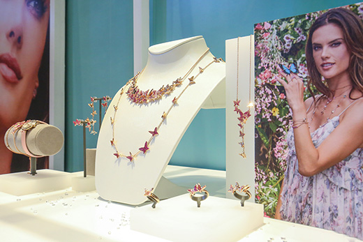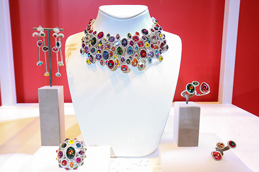 与本季彩虹乐园主题相契合,展区入口以神秘的彩色圆拱形通道引领宾客,步入内场犹如置身五光十色的彩虹乐园,处处洋溢着斑斓的色彩与丰富多样的自然图案。颜色鲜明的展台、大幅海报、鲜花抱枕等活动装饰赋予现场五彩魅力,玩味十足的3D立体拍照墙也为到场宾友带来无限趣味与活力。华丽典雅的高级珠宝系列位居一隅耀眼迷人,光芒四射,晶璨闪亮。