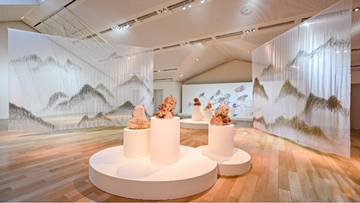 上海“爱马仕之家”《梦之秘境》艺术展——装置《松山》以取自大自然的松针在层层薄纱上编织成图案,营造出雾中远山的景象。