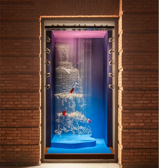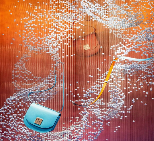 上海“爱马仕之家” 《寄梦》夏季橱窗——“山涧”配饰橱窗用白色珠子悬垂出不同的山水画卷。或似一道飞溅的瀑布,或似一条欢快的溪流潺潺流淌,似乎在探寻着峭壁。之外的胜境。