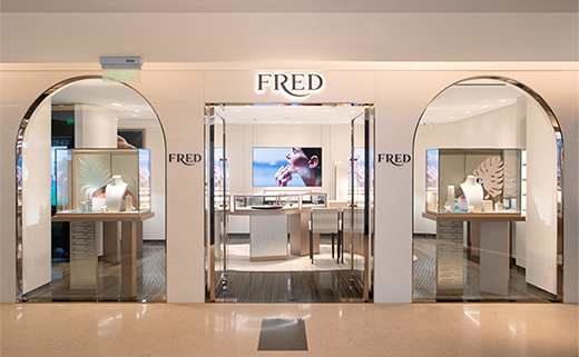 法式风格融入在 FRED 斐登北京国贸精品店的每一处精致的细节中。FRED 斐登为顾客精心打造珠宝与科技融合的互动体验——My FRED Riviera 互动镜。宾客只需要在互动屏幕上选择自己喜爱的 Force 10 系列手链, 选择自己想要体验的旅程:魅力的、趣味的、放松的亦或是运动的,屏幕上就可以自动生成背景,顾客可以进行拍照并分享照片,感受法国蓝色海岸的魅力,体会 FRED 斐登珠宝的独特色彩与摩登。
