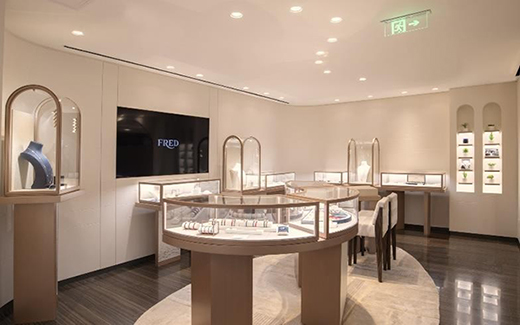 位于北京国贸商城的FRED 斐登店铺以清新淡雅的珠光粉色和温柔的海蓝色为基调,展现女性如水般的晶莹与柔美。流线设计与圆润造型的珠宝陈列柜在引导宾客自由探索的同时,亦用线条打造出别致的现代简约感,亦如法国里维埃拉海岸的优雅风情。倾心打造的贵宾休息室与男士系列区,饱满的圆形桌面搭配轮廓感十足的方形沙发,线条感十足的书架搭配鹅卵石造型的古雅配件,在自然光的倾斜下,将珠宝的奢华与法式优雅融为一体,亦营造出宾至如归的氛围。